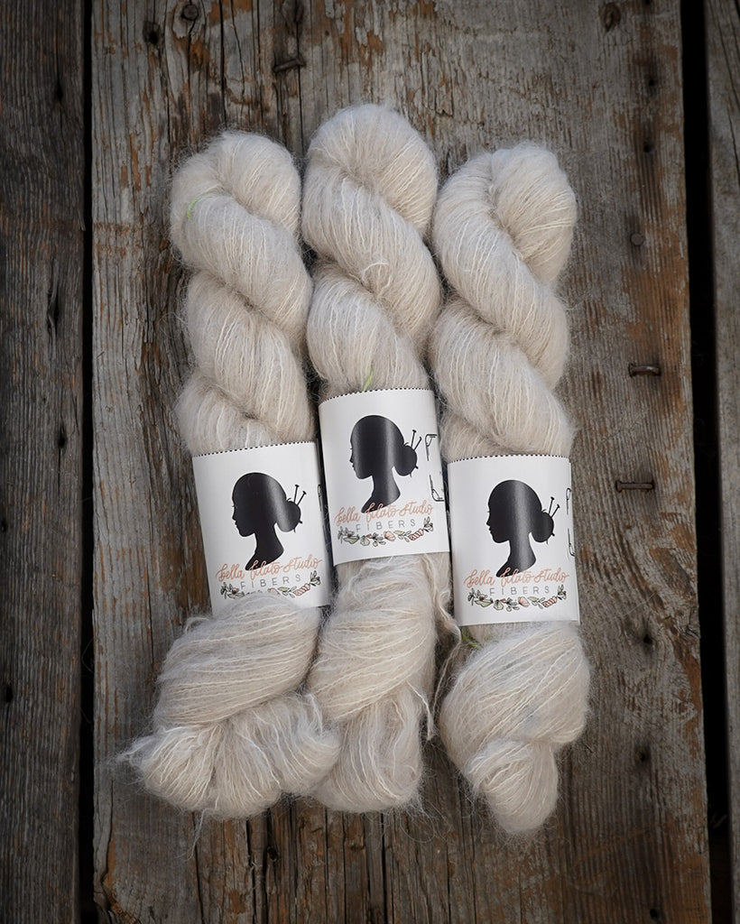 Bella Suri is a light and lofty laceweight yarn with a beautiful brushed texture that adds instant softness and a gentle halo to any project. Spun from 74% Baby Suri Alpaca and 26% Silk, this yarn glows with a soft sheen and feels luxuriously airy against the skin.
