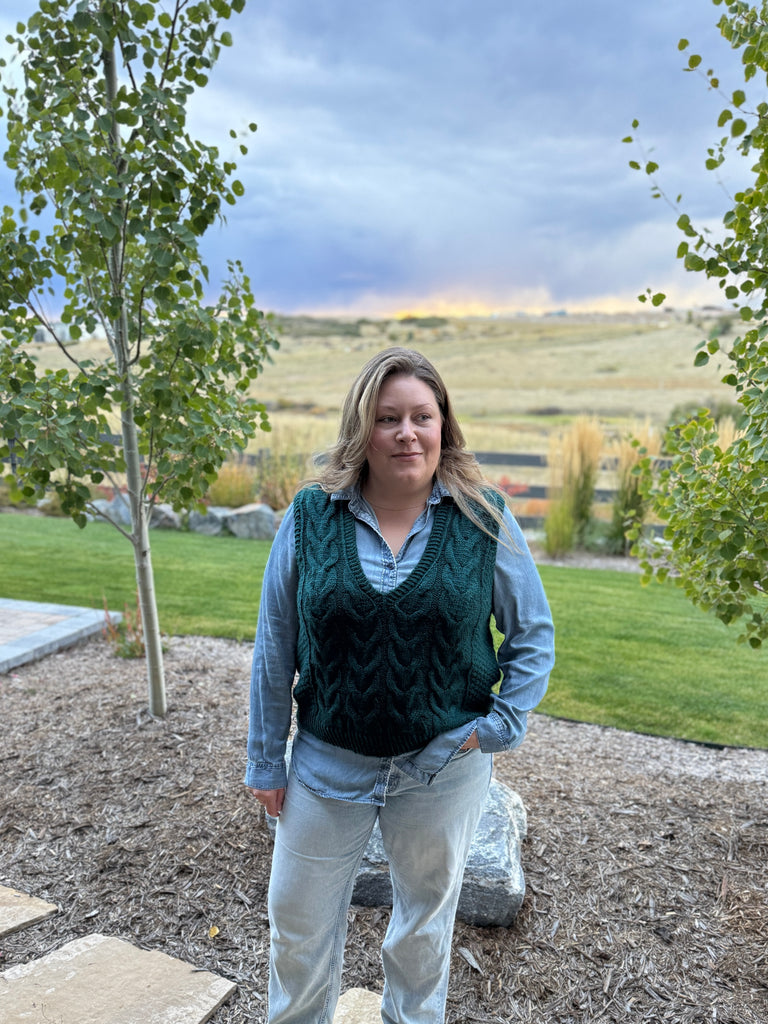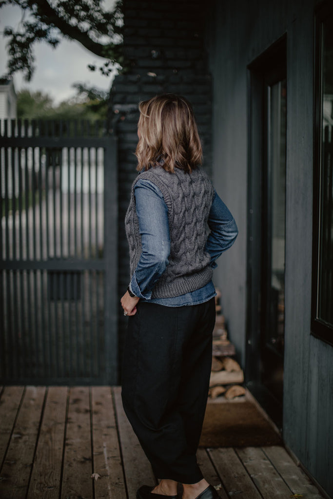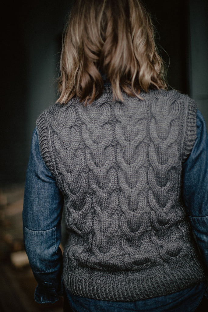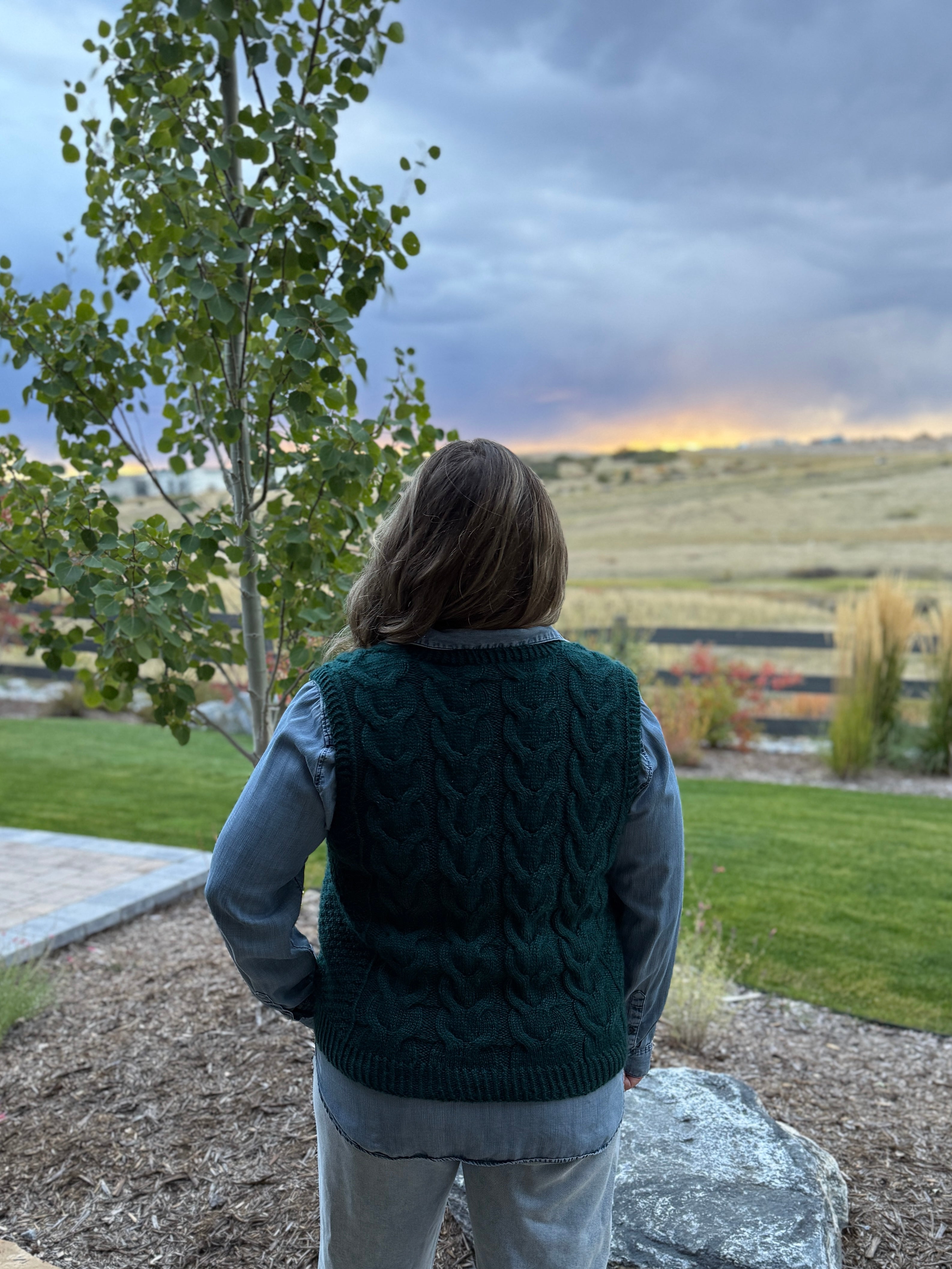 Worked seamlessly from the top down, this design begins at the top of the back, worked flat with subtle increases under the arms. The upper back is then set aside while stitches are picked up to shape the front left and right panels. Once joined, the body is worked in the round to your desired length, and finished with picked-up ribbing around the neckline and armholes for a clean, polished edge. The result? A beautifully structured, layer-friendly vest you’ll reach for all season long — perfect over a crisp shirt, cozy flannel, or your favorite dress.