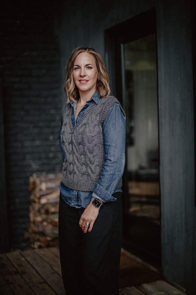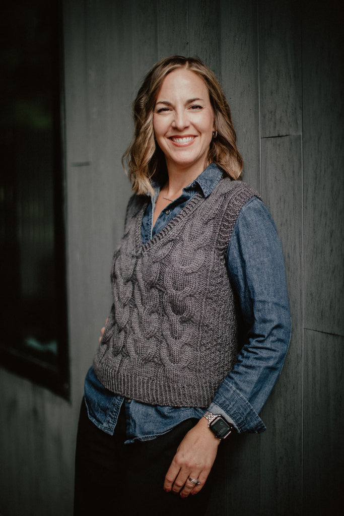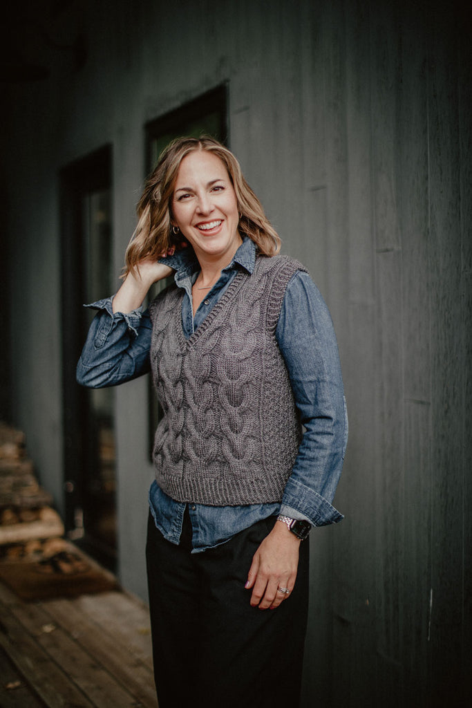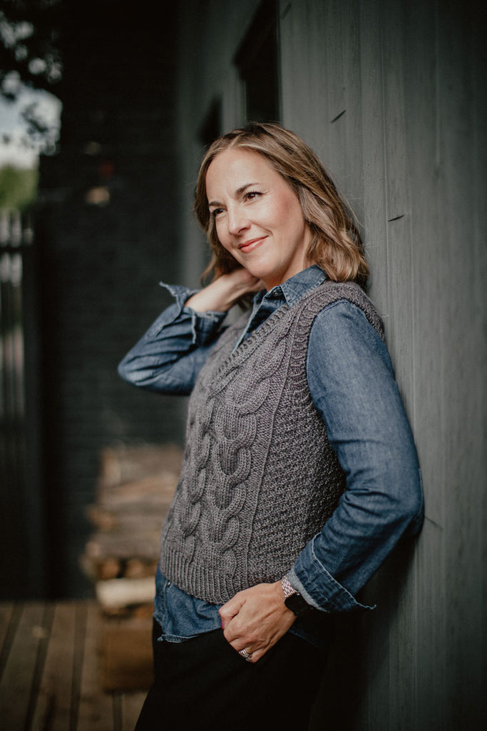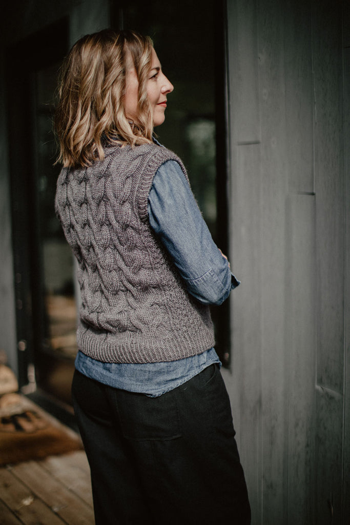 Worked seamlessly from the top down, this design begins at the top of the back, worked flat with subtle increases under the arms. The upper back is then set aside while stitches are picked up to shape the front left and right panels. Once joined, the body is worked in the round to your desired length, and finished with picked-up ribbing around the neckline and armholes for a clean, polished edge. The result? A beautifully structured, layer-friendly vest you’ll reach for all season long — perfect over a crisp shirt, cozy flannel, or your favorite dress.